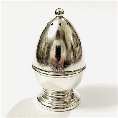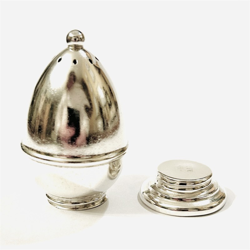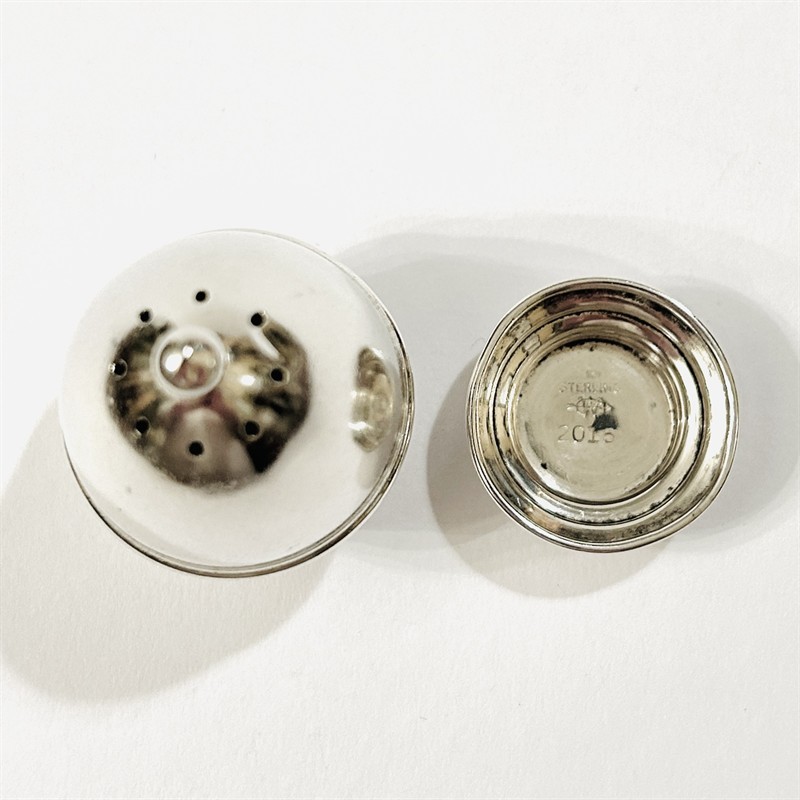 Elegantní slánka/pepřenka vejčitého tvaru, ustupující šroubovací noha, špička s otvory zakončena kuličkou. Minimalistický, nadčasový design z dílen severoamerické stříbrnického výrobce Webster Co. ze 30. až 50. let 20. století. Zhotoveno z nezlaceného stříbra o ryzosti 925/1000; nově opatřeno puncem S-61 (kamzík 2), značení "STERLING", "2016" a značka výrobce zespoda. Hmotnost 16,10 g, výška 58,5 mm, šířka 33,5 mm. V zachovalém stavu, odborně vyčištěno zlatníkem.