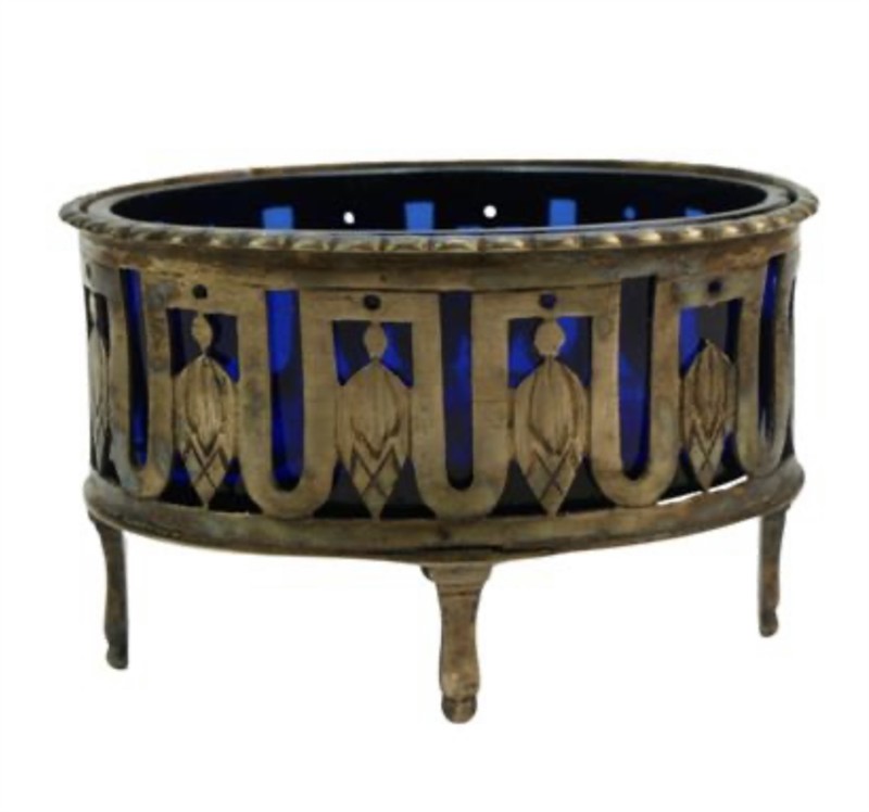 Stribrna stolní slánka zhotovená v secesním stylu. Skelet ze stříbra ryzosti 900/1000, Váha stříbra 32 g a je vyplněna vyjímatelnou miskou z kobaltového skla. Krásná původní zlatnické práce
