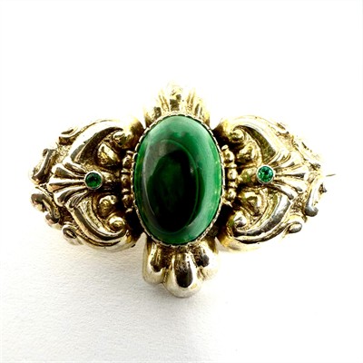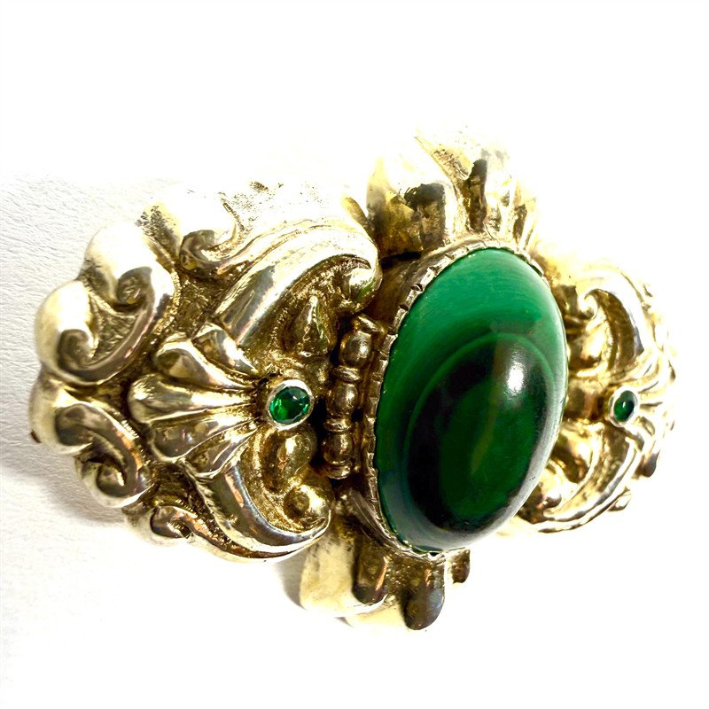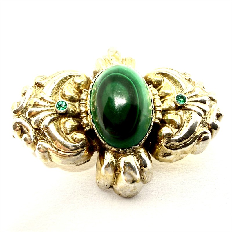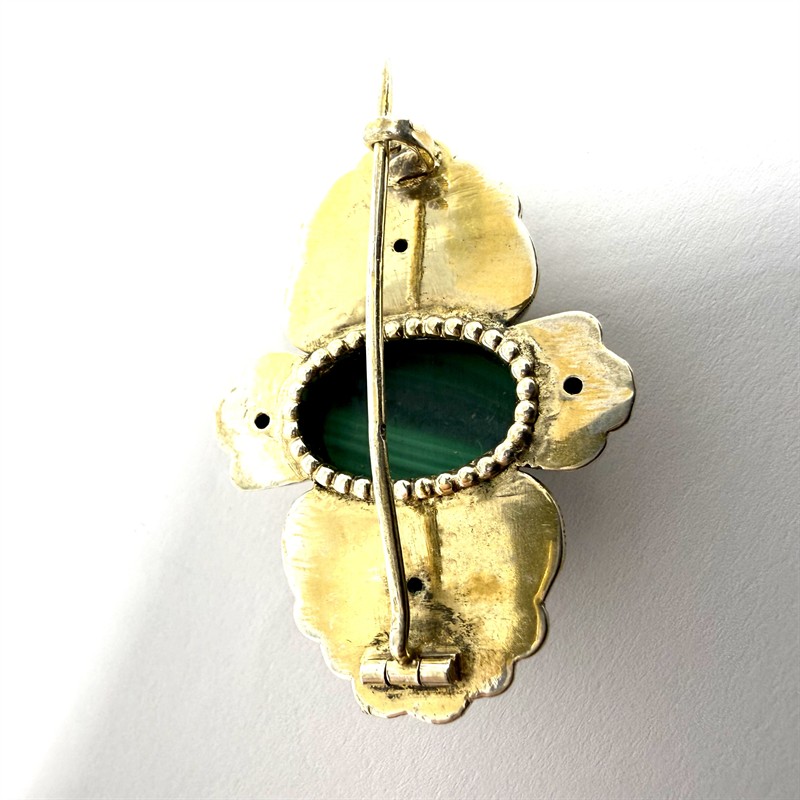 Stříbrná zlacená brož s malachitem