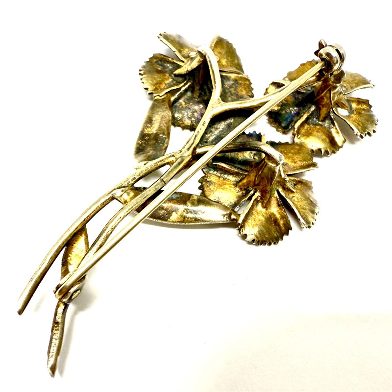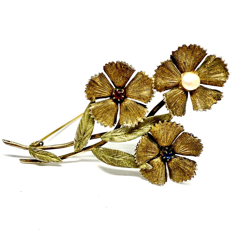 Půvabná brož znázorňující květinu z decentně pozlaceného stříbra. Středy květů zdobí drobný rubín, safír a bílá perla. Šperk byl zhotoven ze stříbra ryzosti 835/1000, o celkové váze 10,50 g. Osvědčení Puncovního úřadu. Rozměry 6,5 x 4 cm. Výborný stav.