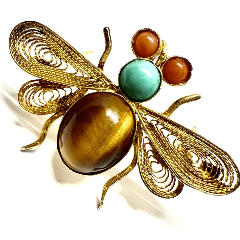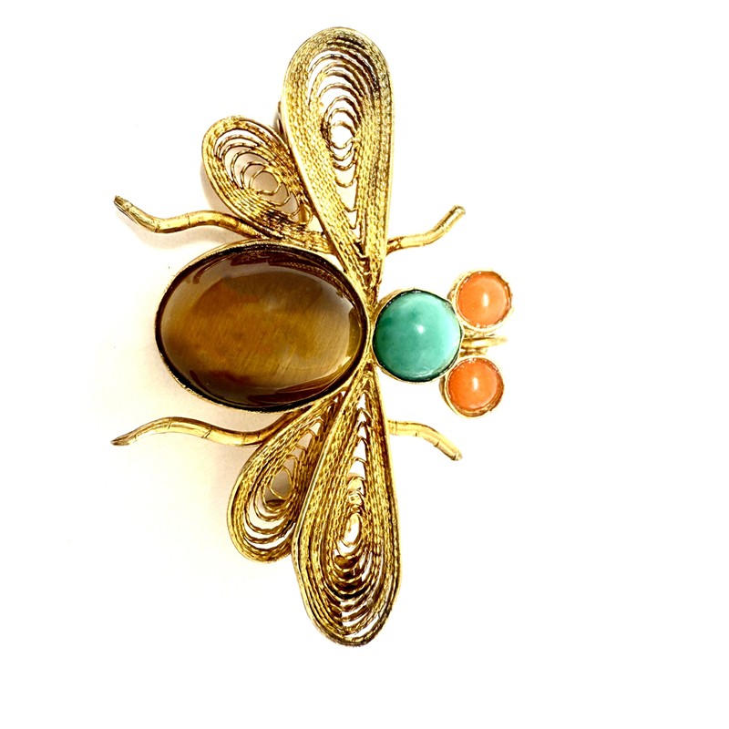 Hravá, drobnější brož, jež může po zavěšení na řetízek sloužit jako závěs. Šperk byl zhotoven ze zlaceného stříbra ryzosti 800/1000, o celkové váze 3,40 g. Šperk zdobí korály, tyrkys a tygří oko. Křídla zhotovena technikou filigránu. Rozměry cca 3,5 x 2,5 cm. Velmi dobry stav.