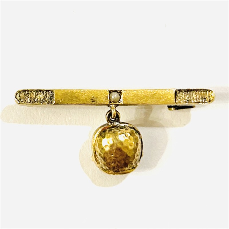 Půvabná, jemná brož z období secese, podlouhlé tělo ve středu osazeno drobnou přírodní bílou perlou, při krajích rytá lůžka patrně určená pro smalt, připojen ověsek v podobě funkčního zvonku, jež je z přední strany zušlechtěn technikou kladívkování. Nápaditá německá zlatnická práce z přelomu 19. a 20. století. Zhotoveno ze zlaceného stříbra o ryzosti 900/1000; ryzostní číslo na jehle, značka "DRGM" (užívaná 1891-1949, registrovaná známka chránící invenční design či technologii daného výrobku). Hmotnost 2,49 g, délka 32 mm, šířka 14 mm. Zapínání na „C“ sponu v pořádku, ponecháno s přirozenou patinou, lze vyčistit, jinak v zachovalém stavu.