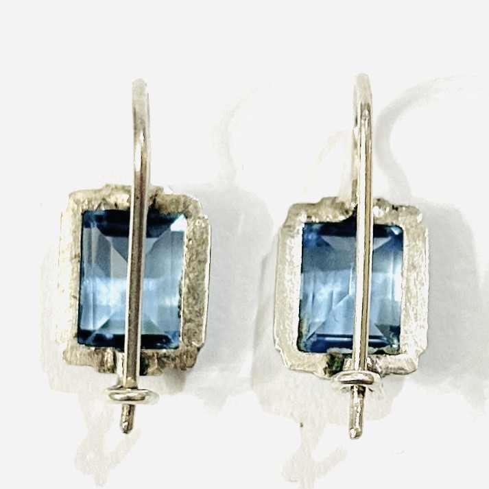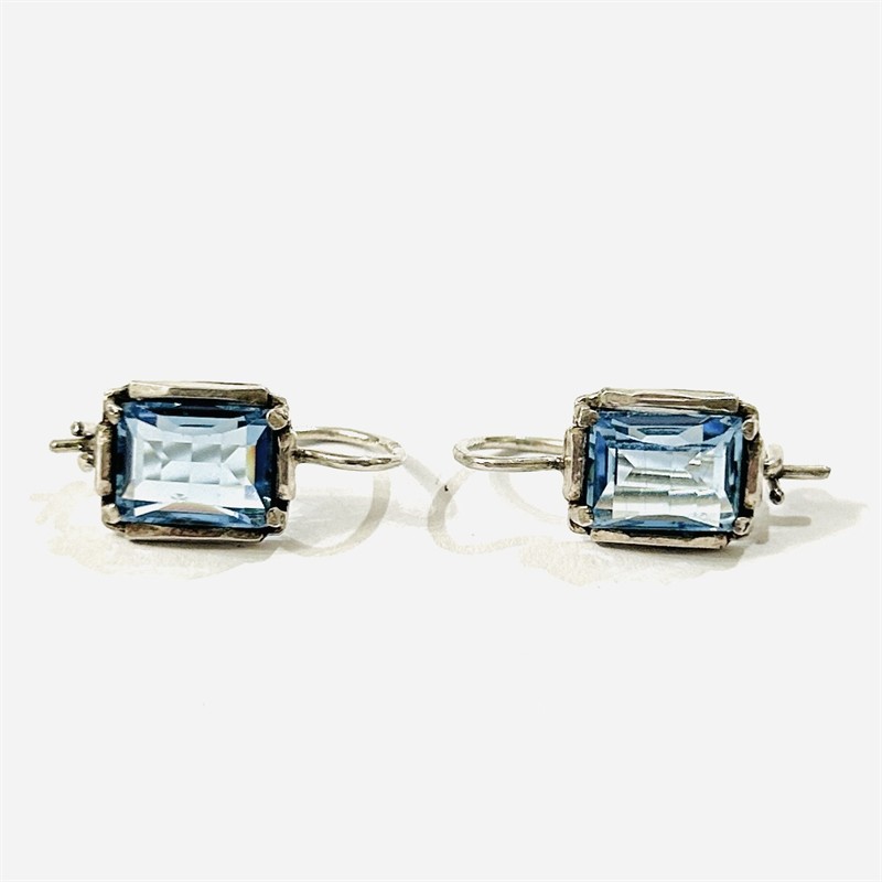 Elegantní, nadčasové náušnice z období pozdního art-deco, hlavici dominuje modrý kámen atypického obdélného brusu, decentní geometrizující rámeček. Práce patrně opavského klenotníka Františka Kalouska ze 40. let 20. století. Zhotoveno z nezlaceného stříbra o ryzosti 900/1000; ryzostní číslo a mistrovská značka "FK" na dřících. Hmotnost 3,00 g, celková délka 18,5 mm, šířka 9,5 mm. Zapínání formou háčku s pojistkami v pořádku, jeden kámen má miniaturní odštěp, není téměř patrné, celkově v zachovalém stavu.