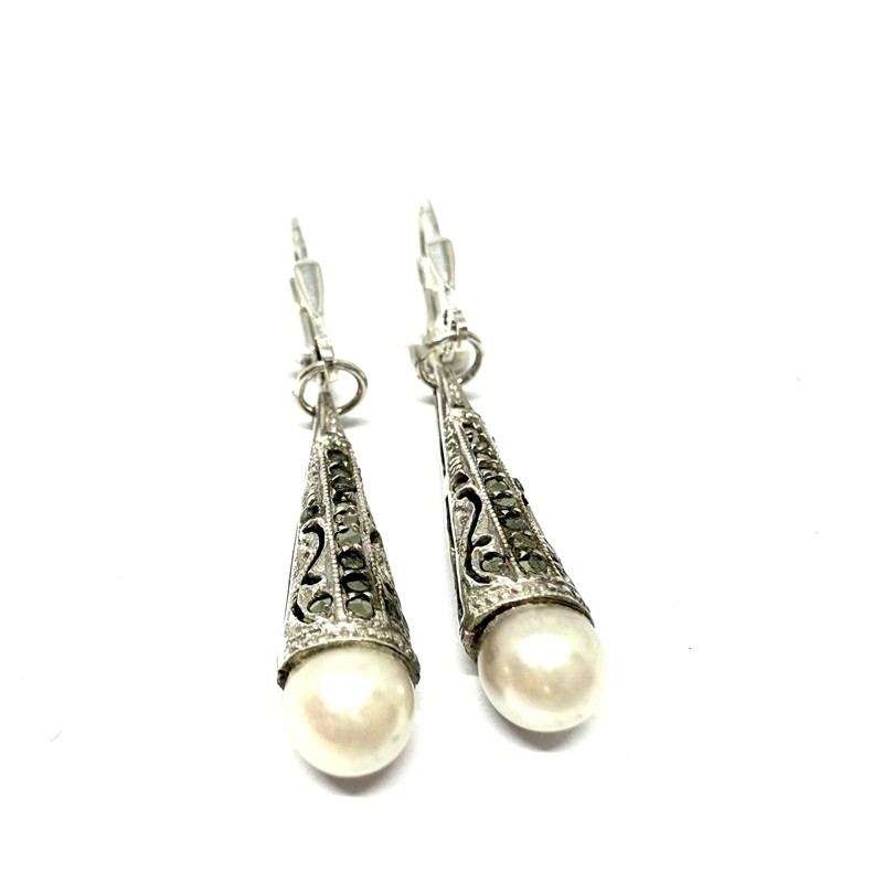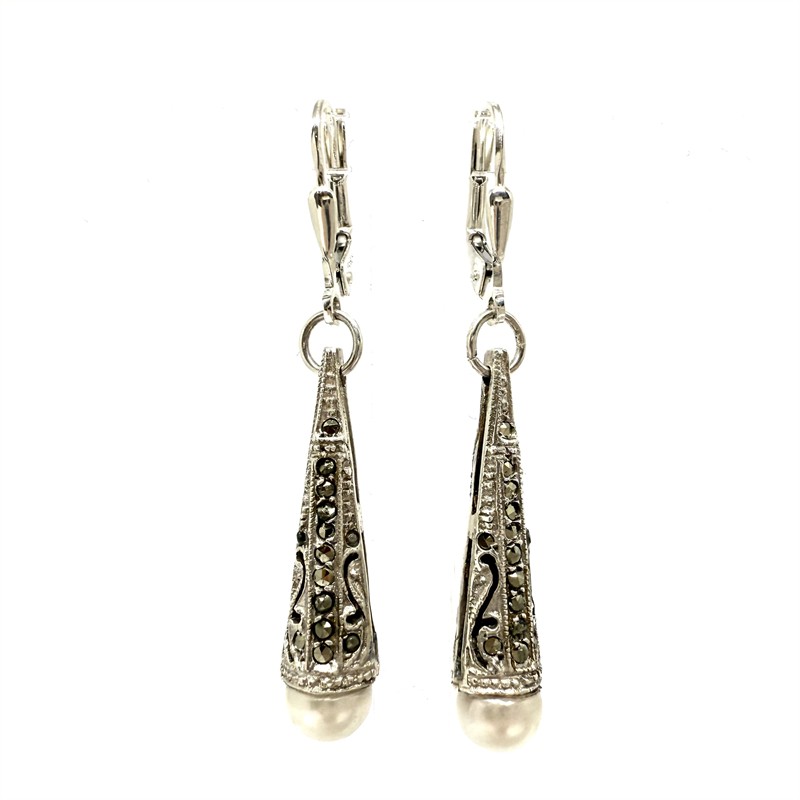 Půvabné závěsné náušnice zhotovené ve stylu Art deco. Sterlingové stříbro (925/1000), celková váha 5,57 g. Náušnice zdobí sněhobílá perla a elegantně se třpytící markazity. Délka 4,5 cm. Čištěno zlatníkem, výborný stav.
