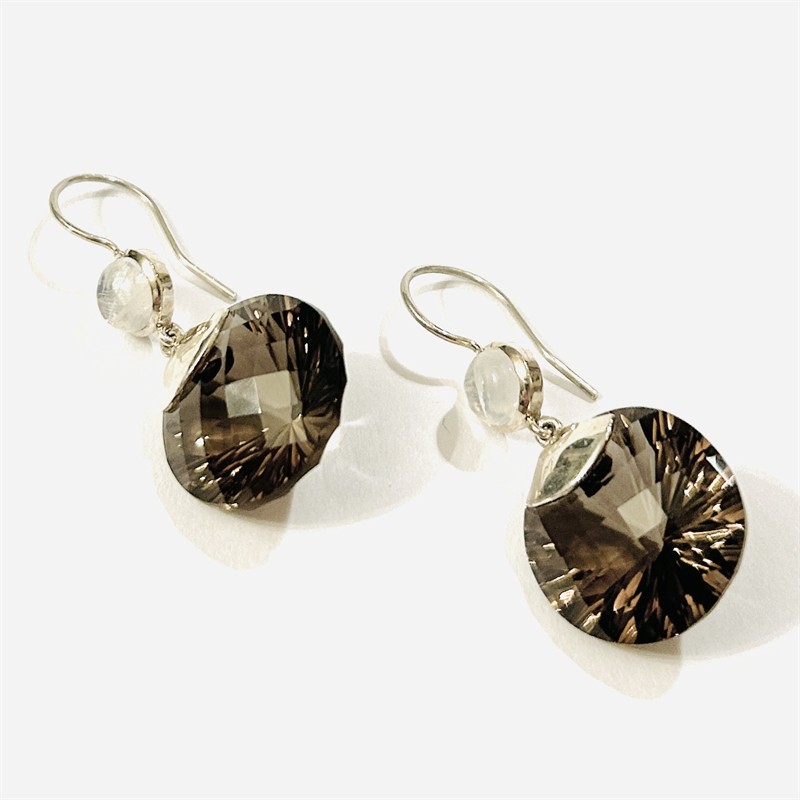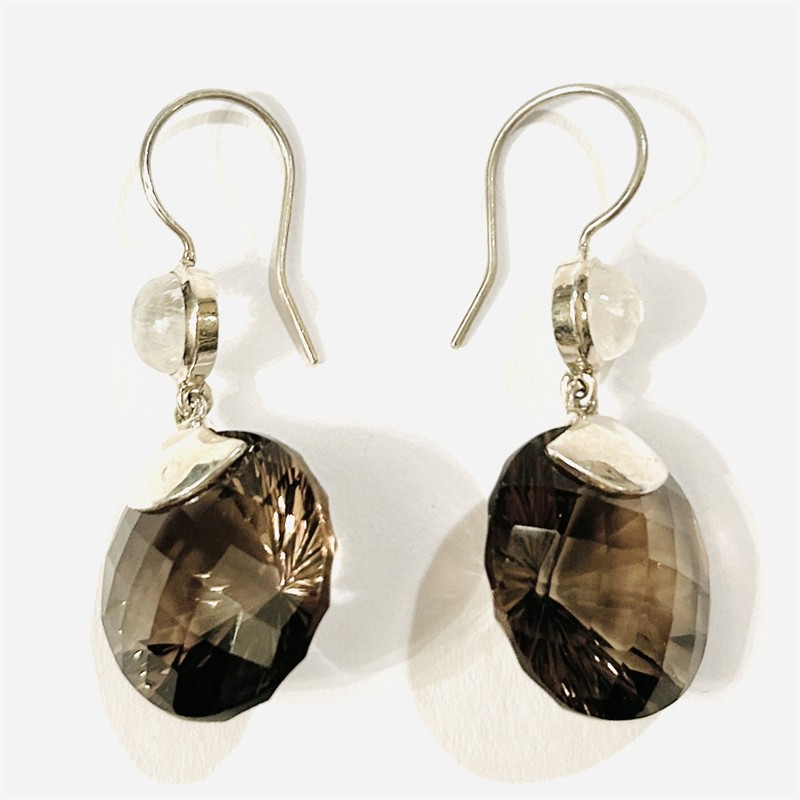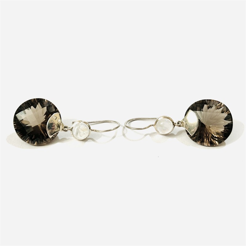 Extravagantní, designové visací náušnice s dominantními ověsky s přírodními záhnědami atypického kulatého brusu, nad nimi v hladké obrubě osazeno kulatými muglemi přírodních měsíčních kamenů. Nápaditá, kvalitní západoevropská práce z první pětiny 21. století. Zhotoveno z nezlaceného stříbra o ryzosti 925/1000; ryzostní číslo z boku. Hmotnost 12,36 g, celková délka 45 mm, šířka 19,5 mm. Zapínání formou dlouhých háčků, v zachovalém stavu.