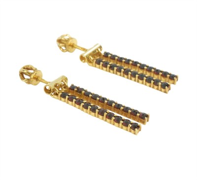 Stříbrné zlacené náušnice ryzosti 900/1000 s českými granáty. Celková hmotnost obou náušnic je 4,42 g. Délka náušnice je 3,2 cm.