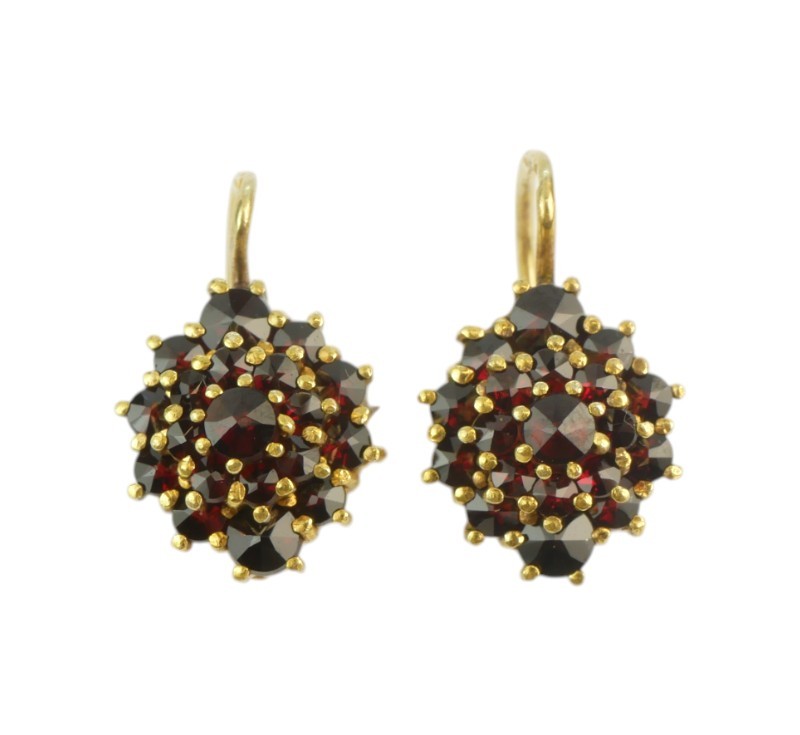 Stříbrné zlacené náušnice ryzosti 900/1000 s českými granáty. Celková hmotnost obou náušnic je 3,31 g. Rozměry náušnice jsou 1,2 x 0,9 cm.