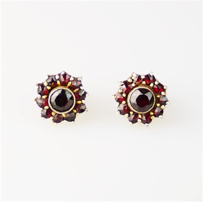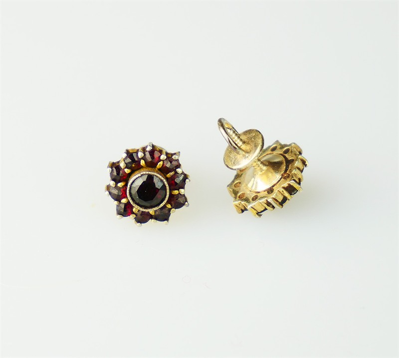 stříbrné zlacené náušnice s granáty, puzeta se závitem, z dílny Granát Turnov, Ag btto 2,37 g/900/1000, Čechy, kolem r. 1960, puncováno (kamzík), průměr 1 cm