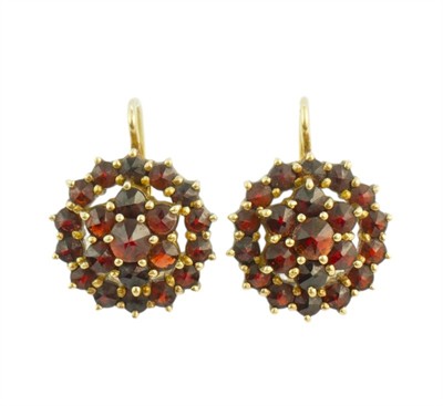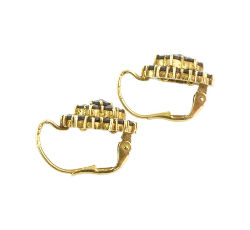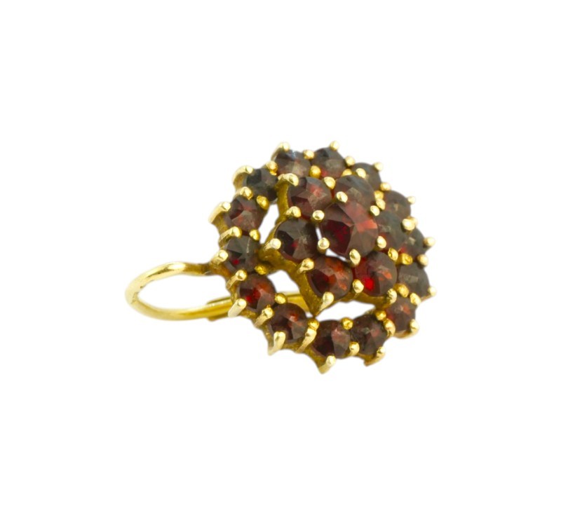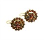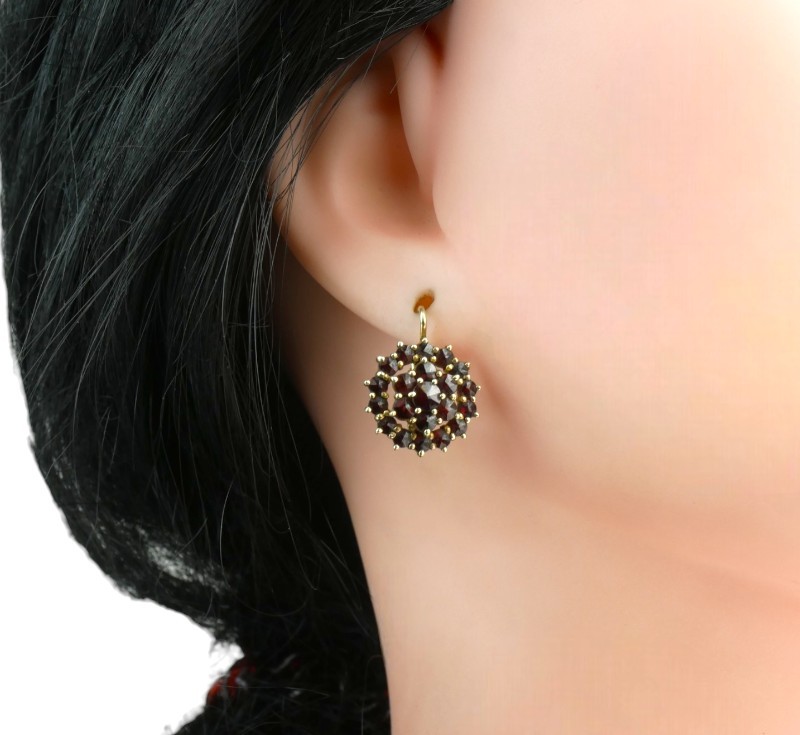 Stříbrné pozlacené třípatrové náušnice s českými granáty ve tvaru květiny, zapínání na dámský patent vyrobené ze stříbra ryzosti 900/1000, Náušnice jsou z dílny Granát Turnov, Čechy, kolem r. 1960. Průměr 1,4 cm. Celková hmotnost 4,23 g.