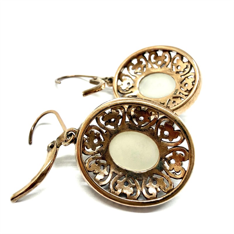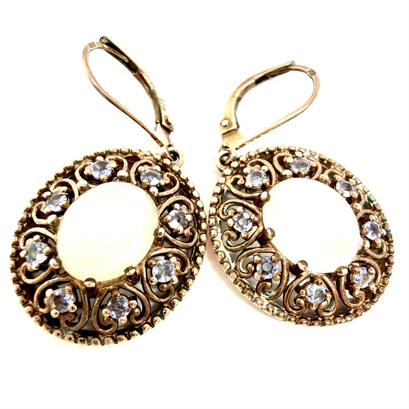 Půvabné, závěsné náušnice. Zhotoveny ze zlaceného stříbra sterlingové ryzosti (925/1000). Celková váha 7,85 g. Náušnice jsou na středu osazeny měsíčním kamenem hladkého brusu kabošon, po obvodu 8 tanzanitů. Délka 3,4 cm. Perfektní stav.