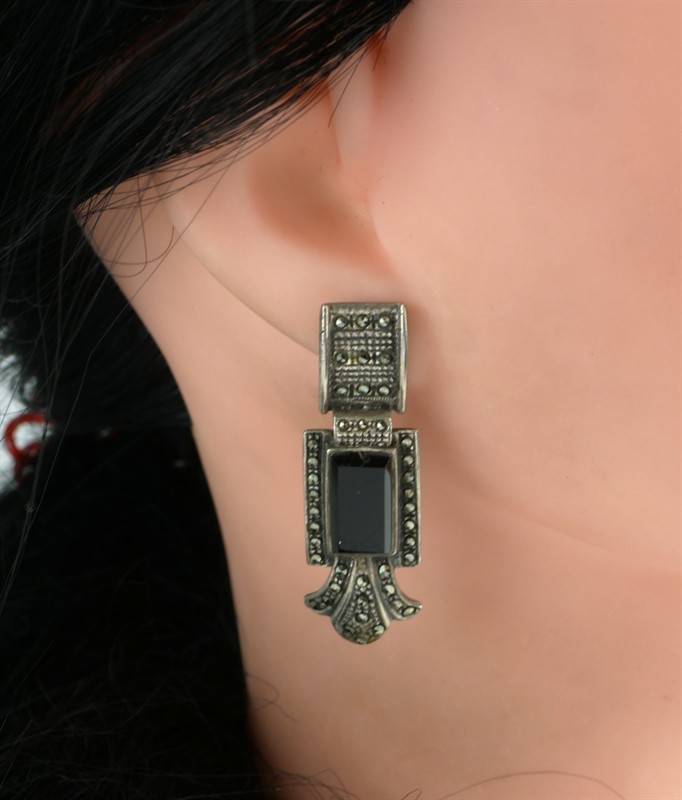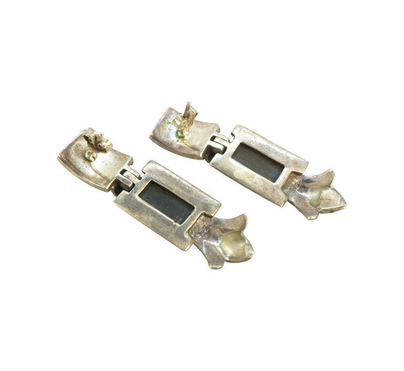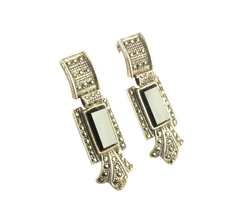 Náušnice ze stříbra ryzosti 925/1000 zdobené onyxy. Rozměry náušnic 4,5 x 2,0 cm. Celková hmotnost 12,76 g.