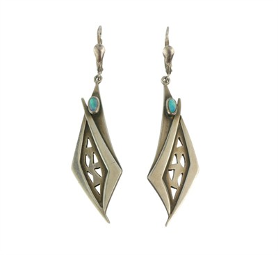 Visací náušnice geometrických tvarů jsou zhotoveny ze stříbra ryzosti 925/1000 a jsou osazeny drobnými opály. Celková hmotnost obou náušnic je 8,20 g. Délka náušnice je 5,6 cm.