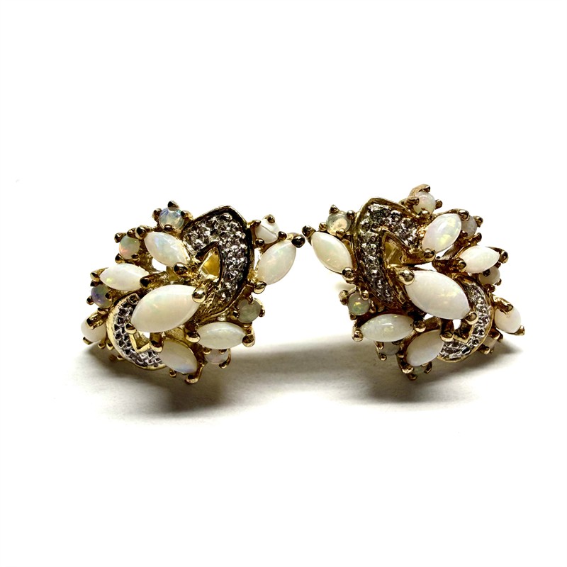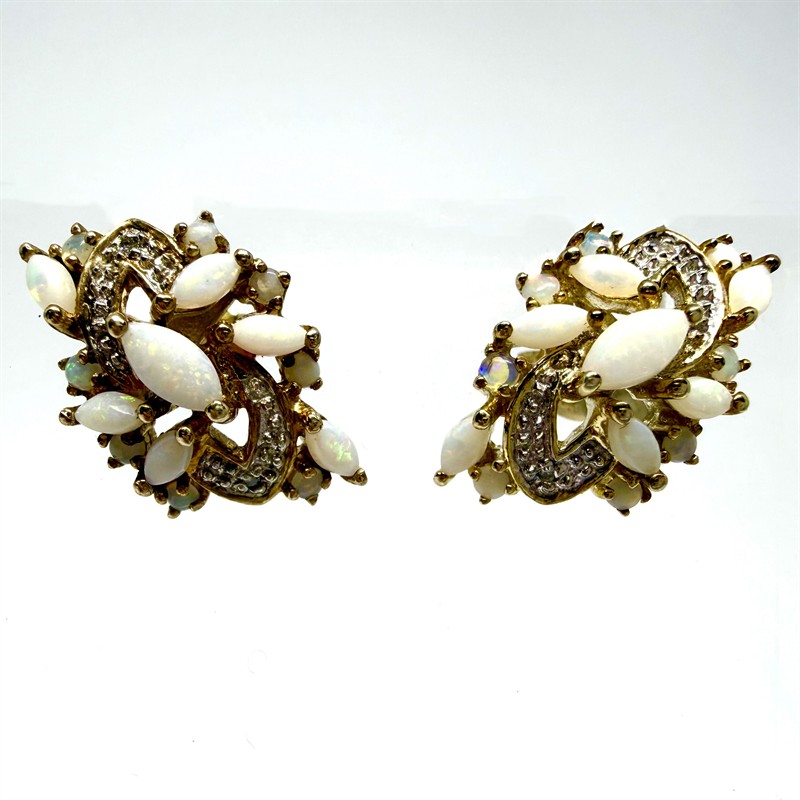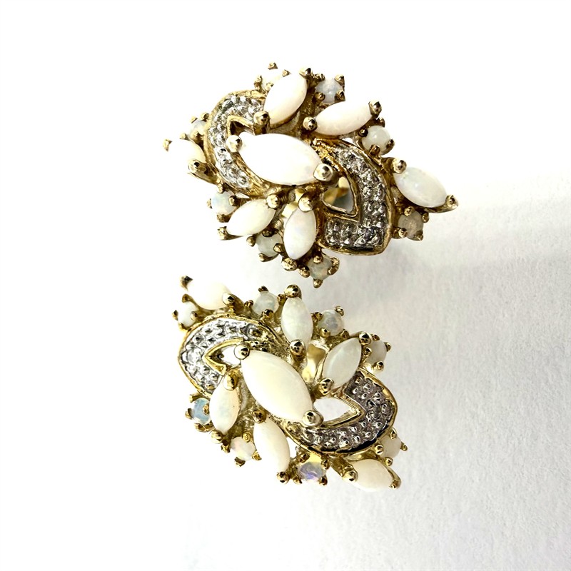 Elegantní, efektní náušnice ze zlaceného stříbra. Bohatě zdobeny světlými opály s červánkovou opalizací. Sterlingové stříbro (925/1000). Celková váha 4,54 g. Perfektní stav.