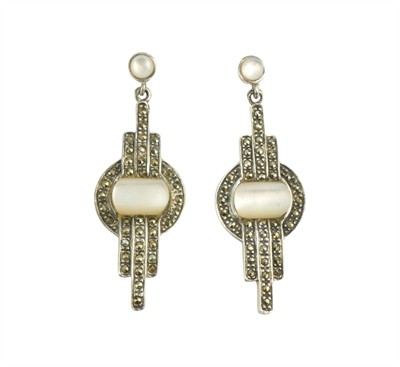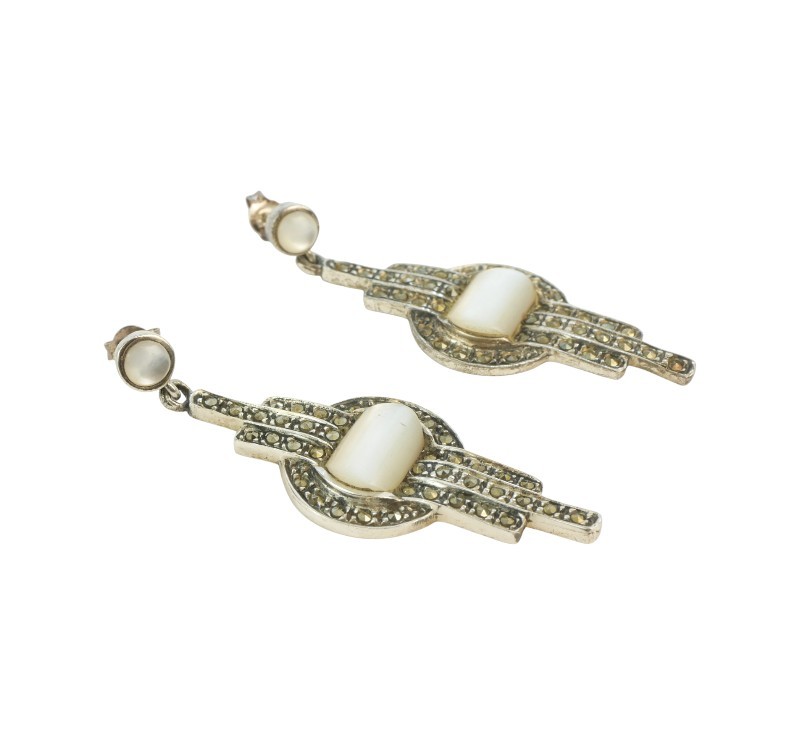 Stříbrné Art Deco náušnice zdobené perletí a markazity, stříbro ryzost 925/1000, hmotnost náušnic 11,9 g. Rozměry 5,3 x 1,8 cm. Art decové náušnice ve výborném stavu.