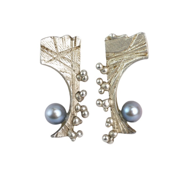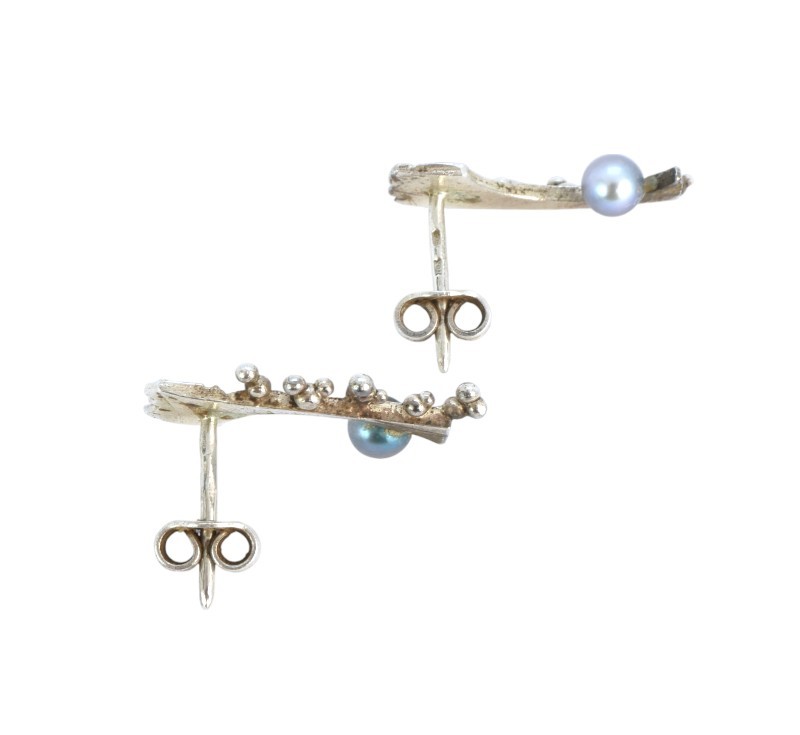 Zajímavé náušnice vyrobené ze stříbra ryzosti 925/1000 zdobené šedomodrými perličkami. Rozměry - výška 2,2 cm. Celková hmotnost 2,90 g.