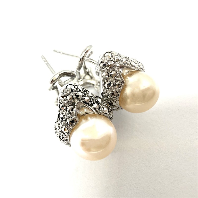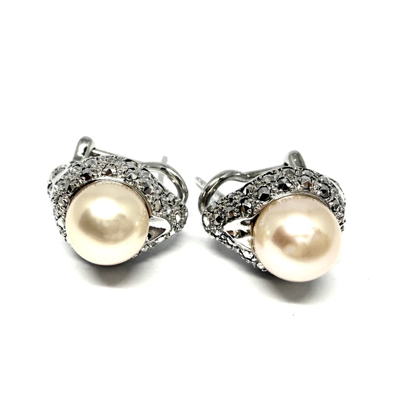 Elegantní, stříbrné náušnice s důmyslným klapkovým zapínáním. Náušnice zdobí perla krémového odstínu, vyznačující se vysokým leskem. Průměr cca 7 mm. Perlu rámují elegantně se třpytící markazity. Náušnice byly zhotoveny ze sterlingového stříbra (925/1000) a jsou označeny ryzostní, autorskou a puncovní značkou. Celková váha 10,14 g. Příjemně nositelný šperk v perfektním stavu.