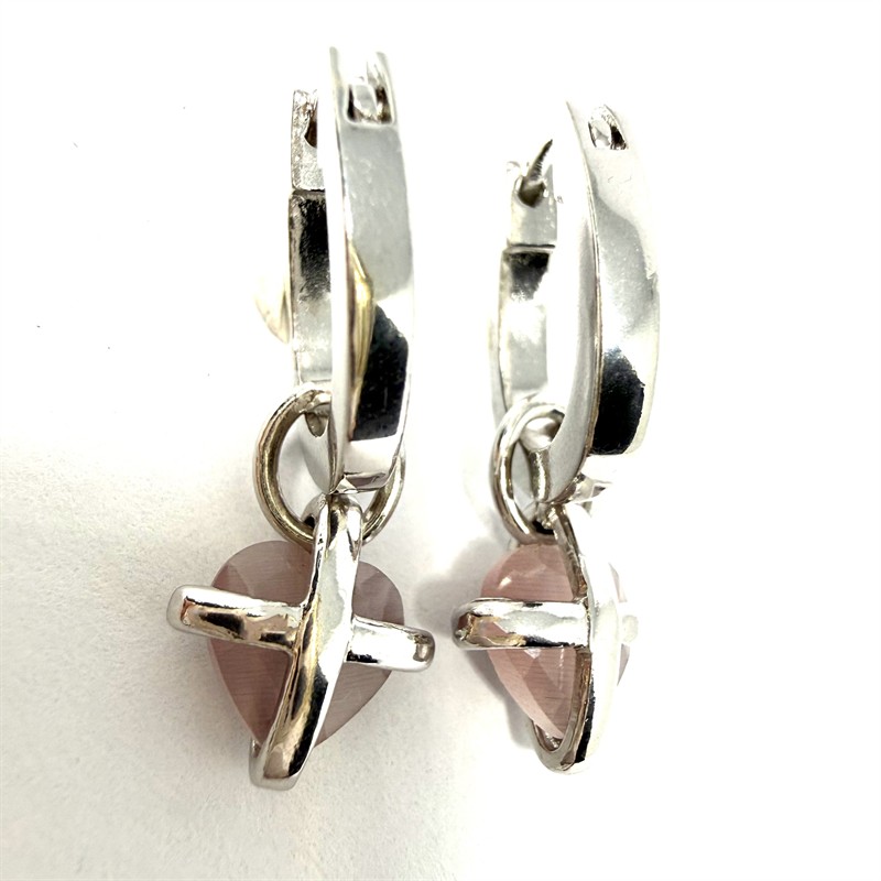 Variabilní, stříbrné náušnice. Masivnější ovály zdobí odnímatelná, kinetické závěsy s růženíny vybroušenými do tvaru srdce. Možnost nošení separátně. Náušnice byly zhotoveny ze sterlingového stříbra (925/1000), o celkové váze 6,45 g. Délka cca 3 cm. Půvabný, příjemně nositelný šperk v perfektním stavu