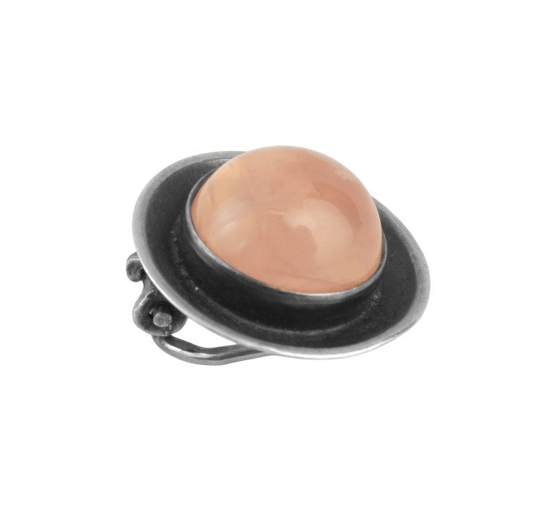 Minimalistické autorské náušnice vyrobené ze stříbra ryzosti 835/1000. Platný český punc, autorská značka a ryzostní číslo. Klipsy s precizně vsazenými růženíny. Pravděpodobně se jedná o německou výrobu z 60. let 20. století. Průměr 1,7 cm. Celková hmotnost 8,55 g.