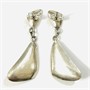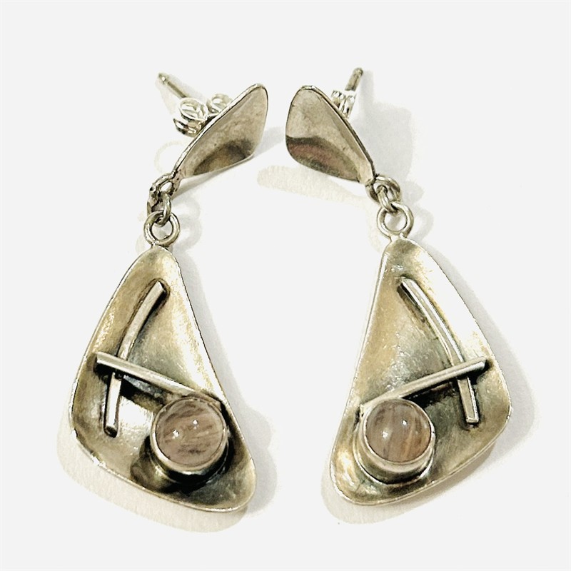 Elegantní, vkusné náušnice v bruselském stylu, ověsek i čelo u zapínání typického buněčného tvaru, miskovitá plocha s kulatou muglí přírodního inkludovaného růženínu, prostorově výraznější zakřivené linie. Patrně severoevropská ateliérová práce z 60. let 20. století. Zhotoveno z nezlaceného stříbra o ryzosti 925/1000; nově opatřeno puncem S-61 (kozlík 2) na dřících. Hmotnost 4,36 g, celková délka 41 mm, šířka 16 mm. Zapínání formou nových puzet, ponecháno s přirozenou patinou, lze vyčistit, celkově v zachovalém stavu.