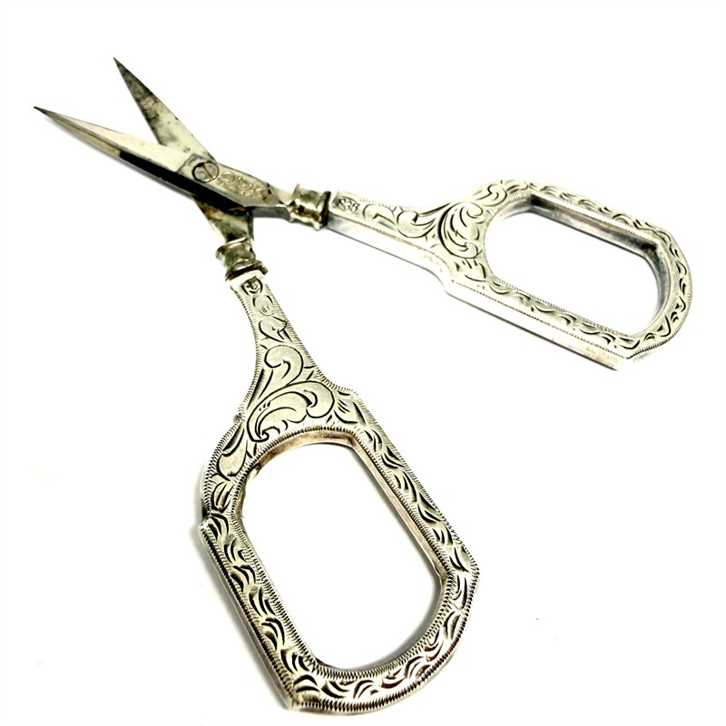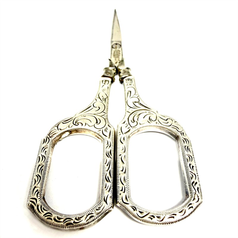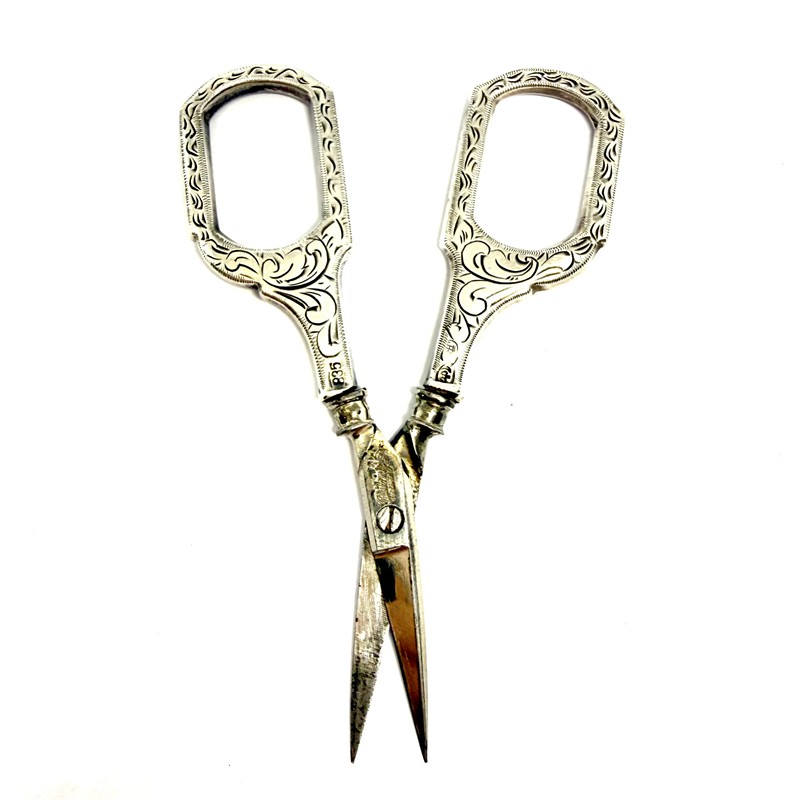 Malebné, stříbrné nůžky. Rukojeť nůžek zdobí bohaté, precizní, ruční rytí a je vyrobena ze stříbra ryzosti 835/1000. Ocelové čepele značeny Solingen. Celková váha 14,23 g. Rozměry 8,5 x 4,5 cm. Nůžky jsou plně funkční a ve výborném stavu.