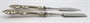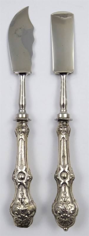 Stříbro, leštěná ocel. Ryzost Ag 800/1000, celková hmotnost 84,50 g. Stříbrné elegantní příbory na máslo či měkký sýr. Rukojeti ze stříbra zdobené reliéfními ornamenty. Čepele z leštěné oceli. Jedna z rukojetí je místy poškozená. Značeno: rakousko-uherský punc hlava psa a mistrovská značka. Rakousko-Uhersko 1866 - 1890. Jednotná délka 20 cm.
