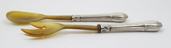 Stříbro, rohovina. Ryzost Ag 750/1000, celková hmotnost 150,35 g. Přiloženo osvědčení Puncovního úřadu České republiky. Příbory na salát se stříbrnou rukojetí zdobenou reliéfními linkami, pletenci a symbolem trojlistu. Horní části z rohoviny. Značeno: ryzost 750. Německo 1870 - 1900. Délka vidlice 26,5 cm, délka lžíce 25,5 cm.