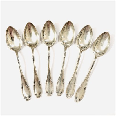 Půvabná souprava skládající se z 6 lžiček v klasicizujícím secesním stylu, oboustranně kraje střenky s jemným plastickým stužkovým reliéfem s květy růže. Tradiční design stolního stříbra, solidní německá stříbrnická práce z konce 19. století. Zhotoveno z nezlaceného stříbra o ryzosti 800/1000; vyhotoveno osvědčení puncovního úřadu, německý punc "srpek měsíce s korunou" a ryzostní číslo zvnějšku misky. Celková hmotnost 144,90 g, délka 14 cm, šířka 29 mm. Ponecháno s lehkou přirozenou patinou, lze vyčistit, celkově v zachovalém stavu.