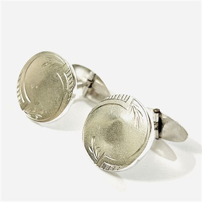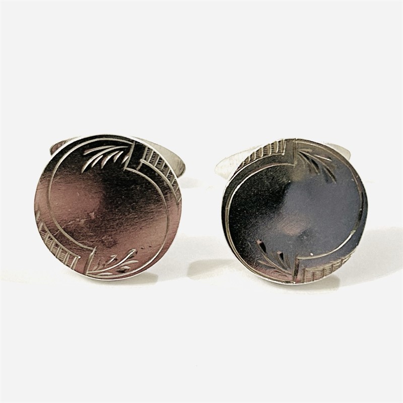 Elegantní, kulaté manžetové knoflíčky z období secese, při kraji dekorativně ryto. Polská (Varšava) zlatnická práce z počátku 20. století. Zhotoveno z nezlaceného stříbra o ryzosti 800/1000; dodatkový polský punc pro stříbro "selka", starší punc "selka 3" a mistrosvká značka "ST" na provlékací části a zespoda. Hmotnost 5,74 g, průměr hlavice 19 mm. Patkové zapínání v pořádku, stopy nošení, zohledněno v ceně, jinak v dobrém stavu, odborně vyčištěno a vyleštěno zlatníkem.