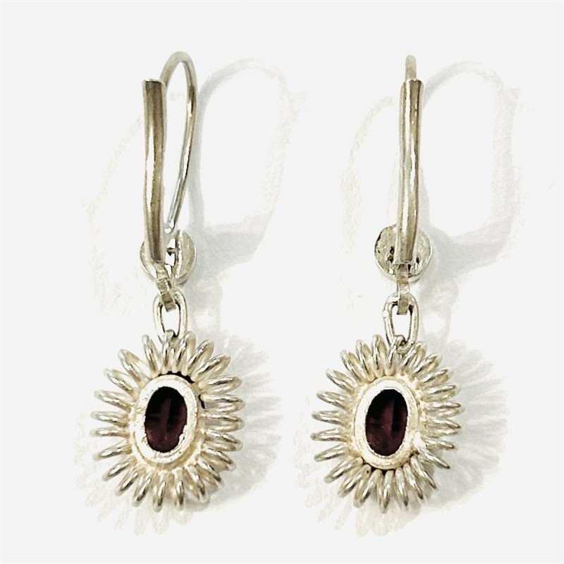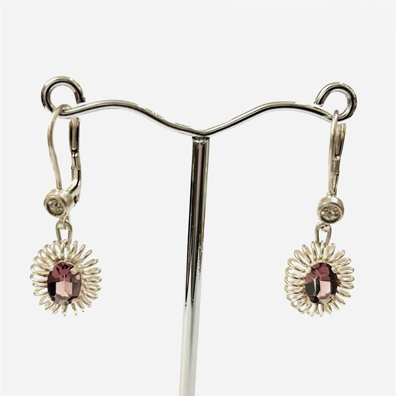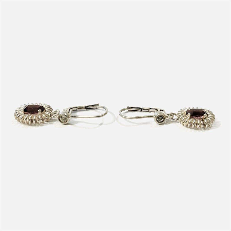 Elegantní visací náušnice, ověsky ve spirálovitém rámečku osazeny fialovými skly oválného brusu, čelo v zrnité obrubě s brilantními čirými skly kulatého brusu. Nápaditá tuzemská práce z konce 30. či 40. let 20. století. Zhotoveno z nezlaceného stříbra o ryzosti 800/1000; ryzostní číslo a mistrovská značka "AR" na dřících. Hmotnost 2,89 g, celková délka 32 mm, šířka 11 mm. Klapkové zapínání v pořádku, celkově ve velmi zachovalém stavu.