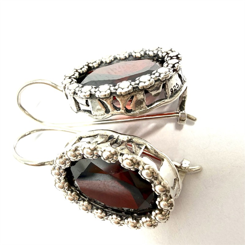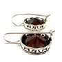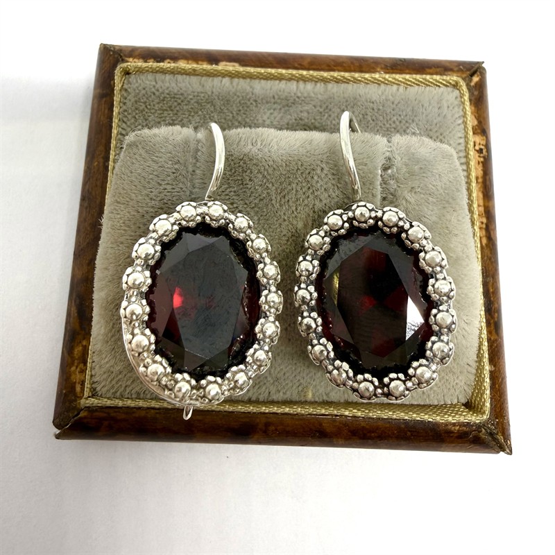 Půvabné, závěsné náušnice zhotovené ze sterlingového stříbra (925/1000). Celková váha 10,9 g. Délka 2,7 cm. Šperk je osazen velkým, temně červeným granátem, který půvabně rámuje dekor s drobnými kvítky. Náušnice byly profesionálně vyčištěny a jsou v perfektním stavu. Vhodné pro denní užití i slavnostní příležitosti.