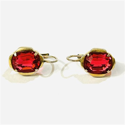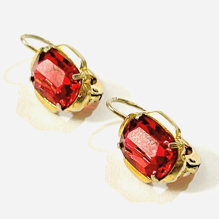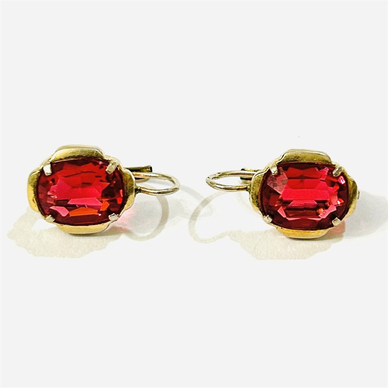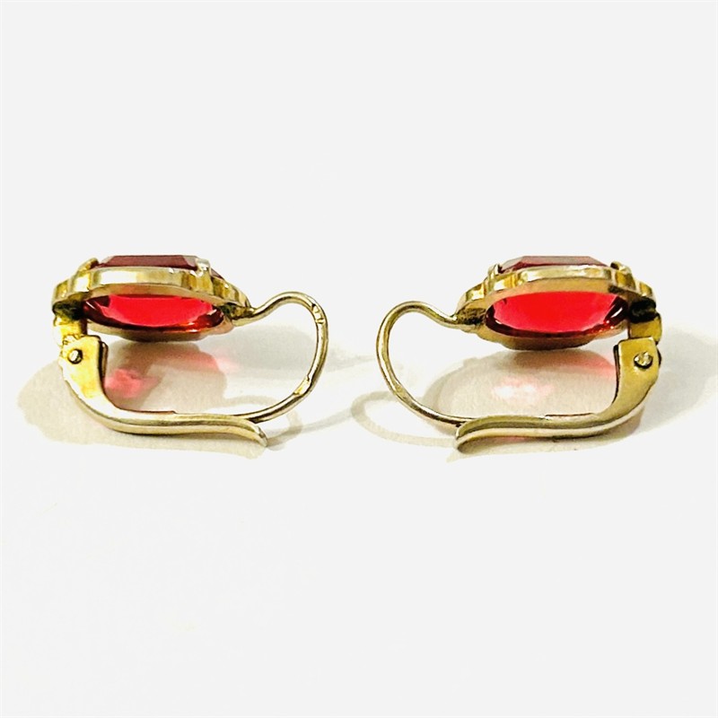 Elegantní, nadčasové náušnice z období art-deco, hlavici dominuje červený kámen zaobleného obdélného brusu, decentní hladký rámeček. Práce jabloneckého klenotníka Heinricha Kincla z 2. poloviny 30. let 20. století. Zhotoveno ze zlaceného stříbra o ryzosti 800/1000; prvorepublikový punc S-48 (slovenské trojvrší 3) a mistrovská značka "HK" na dřících. Hmotnost 2,71 g, celková délka 17 mm, šířka 10 mm. Klapkové zapínání v pořádku, zlacení místy setřeno, celkově v zachovalém stavu.