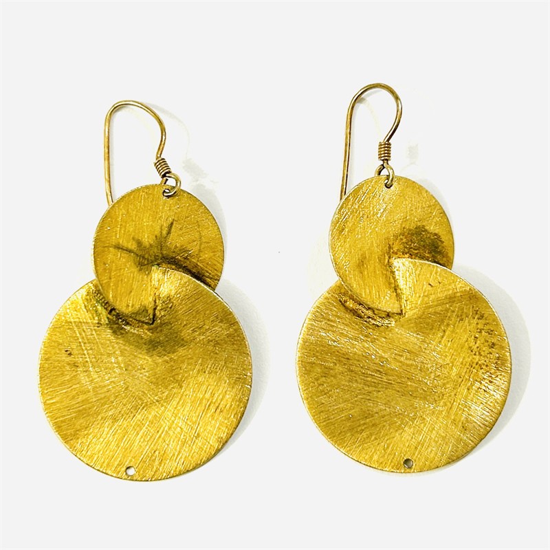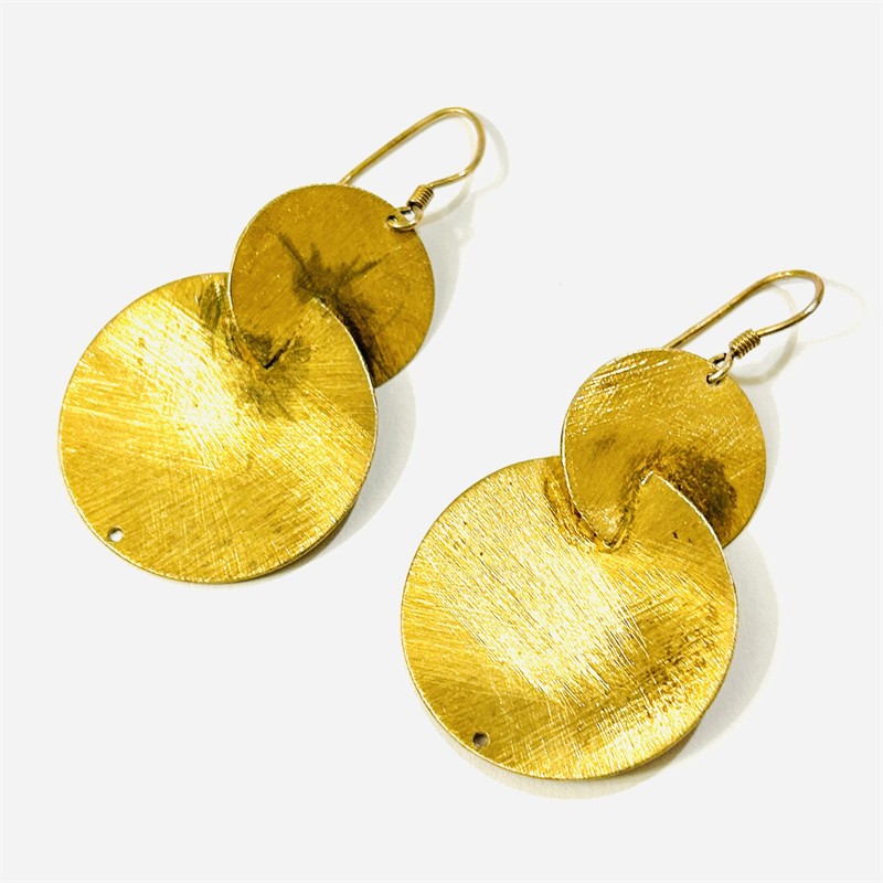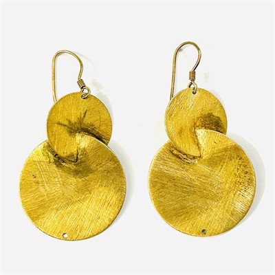 Extravagantní visací náušnice, tělo tvořeno prostorově výraznými propojenými kruhy. Celý povrch zušlechtěn efektním ručním broušením, potaženo žlutým zlatem. Patrně evropská ateliérová práce z první pětiny 20. století. Zhotoveno ze zlaceného stříbra o ryzosti 925/1000; punc S-61 (kozlík 2) a ryzostní číslo na háčcích. Hmotnost 10,44 g, celková délka 58 mm, šířka 30 mm. Zapínání formou háčku v pořádku, při dolním okraji dírka pro případné zavěšení ověsku. Ponecháno s jemnou přirozenou patinou podtrhující design šperku, celkově ve velmi zachovalém stavu.