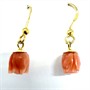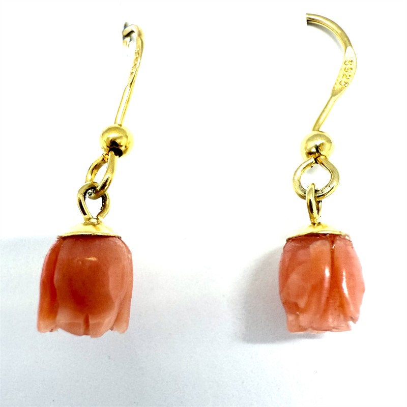 Jemné, půvabné náušnice ze zlaceného stříbra. Náušnice zdobí kinetický ověs - ručně vyřezaný z mořského korálu, sytějšího lososovitého odstínu do tvaru květu růže. Stříbro ryzosti 925/1000, celková váha 1,05 g. Délka cca 2,5 cm. Perfektní stav.