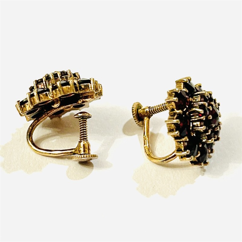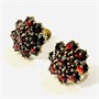 Elegantní náušnice s hlavicí v podobě kulatého květu, v řadách a stupních osázeno českými granáty kulatého hvězdicového brusu, fasováno zrnkovou technikou. Tradiční design, kvalitní granátnická práce DUV Granát v Turnově z poloviny 50. let 20. století, exportováno do Švédska na objednávku stockholmského klenotníka Heriberta Engelberta. Zhotoveno z narůžovělé zlaceného stříbra o ryzosti 830/1000; vyhotoveno osvědčení puncovního úřadu, švédský punc "3 koruny", ryzostní číslo a mistrovská značka na zapínání. Hmotnost 4,66 g, průměr hlavice 15 mm. Zapínání na anglický šroubek v pořádku, ponecháno s jemnou přirozenou patinou, lze vyčistit, celkově ve velmi zachovalém stavu.