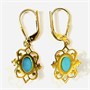Velice elegantní visací náušnice s prořezávanými ověsky v historizujícím tvarosloví, osazeno v plně přiléhajících obrubách oválnými muglemi přírodního tyrkysu odstínu "sleeping beauty" (původem z USA). Netuzemská šperkařská práce z 10. let 21. století od maďarské firmy Emporia. Zhotoveno ze zlaceného stříbra o ryzosti 925/1000; ryzostní číslo na klapkách. Hmotnost 3,02 g, celková délka 33 mm, šířka 13,5 mm. Klapkové zapínání v pořádku. Nenošeno, v intaktním stavu, součástí certifikát.