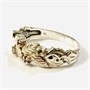Nevšední, vkusný prsten ve stylu Black Hills jewelry, jež jsou typické svými zlatými rytými lístečky, dále decentně doplněno přírodními granáty, topazy, olivínem (peridot) a citrínem kulatého brusu fasovaných krapnami. Patrně jihodakotská práce z počátku 20. století. Zhotoveno z nezlaceného stříbra o ryzosti 925/1000, lístečky ze žlutého a červeného 12 karátového zlata, tj. o ryzosti 500/1000; punc S-61 (kozlík 2), ryzostní číslo a značka výrobce zevnitř šíny. Hmotnost 4,24 g, velikost 63, šířka hlavice 7 mm. V zachovalém stavu, odborně vyčištěno.