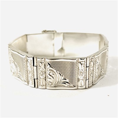 Výrazný, dekorativní náramek z období pozdního art-deco, skládající se z úzce sesazených vlnitě tvarovaných obdélných článků, jež jsou zušlechtěny v geometrickém členění lineárním gilošováním a stylizovaným florálním gravírováním. Kvalitní zlatnická práce košického klenotníka Henrika Amsela ze 40. let 20. století. Zhotoveno z nezlaceného stříbra o ryzosti 900/1000; dobově slovenský punc S-62 (kozlík 3), ryzostní číslo a mistrovská značka "HA" na zapínání. Hmotnost 26,46 g, délka 18,6 cm, šířka 17 mm. Jazýčkové zapínání včetně "8" pojistky v pořádku. Ve velmi zachovalém stavu, odborně vyčištěno a vyleštěno zlatníkem.