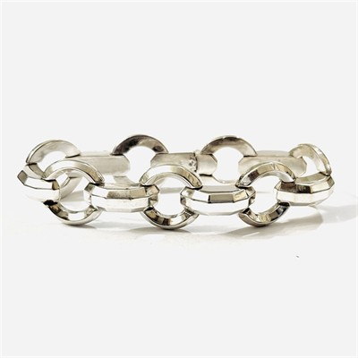 Výrazný, geometricky pojatý náramek s kulatými a obdélnými články s efektními fazetami. Kvalitní zlatnická práce pražské klenotnického podniku Primosa z let 1941-1944. Zhotoveno z nezlaceného stříbra o ryzosti 800/1000; protektorátní punc S-53 (šachovnice 5), ryzostní číslo a mistrovská značka "PA" na zapínání. Hmotnost 25,03g, délka 19,2 cm, šířka 18 mm. Jazýčkové zapínání včetně "8" pojistky v pořádku, u zapínání letováno (není příliš patrné), jinak v zachovalém stavu, odborně vyčištěno a vyleštěno zlatníkem.