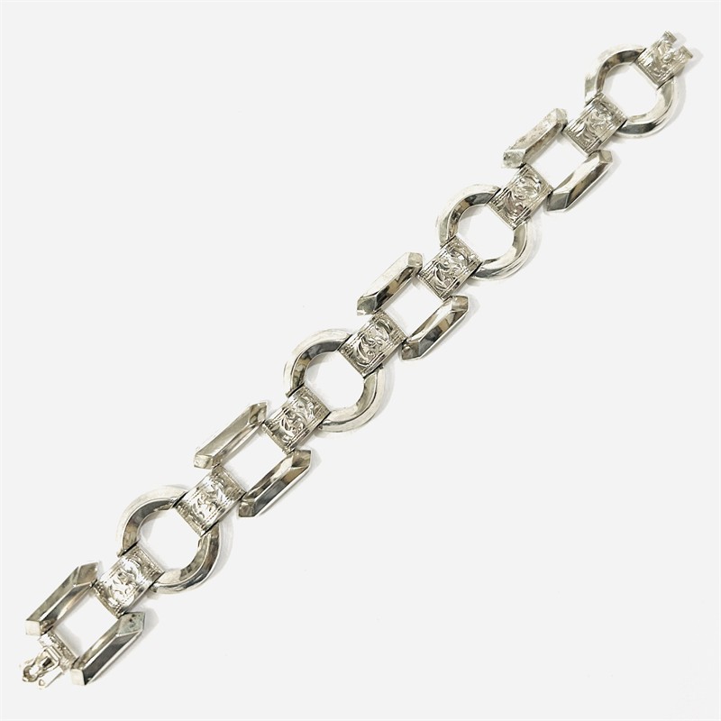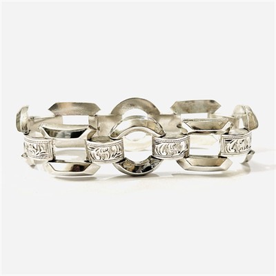 Výrazný, geometricky pojatý náramek s kulatými články s efektními fazetami, obdélné zdobeny gravírováním. Kvalitní tuzemská zlatnická práce z 30. let 20. století. Zhotoveno z nezlaceného stříbra o ryzosti 900/1000; prvorepublikový punc S-46 (slovenské trojvrší 3), ryzostní číslo a mistrovská značka "OT" na zapínání. Hmotnost 27,06 g, délka 19,5 cm, šířka 18,5 mm. Jazýčkové zapínání včetně "8" pojistky v pořádku, lehké stopy nošení, celkově v dobrém stavu, odborně vyčištěno a vyleštěno zlatníkem.