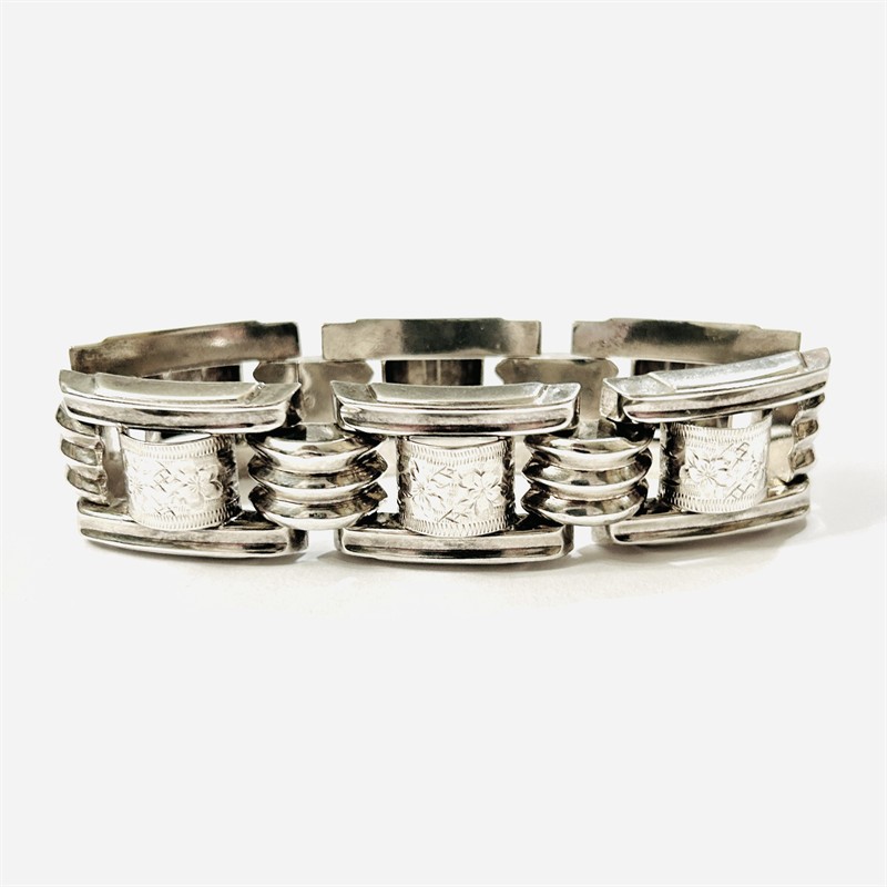 Výrazný, široký náramek z období art-deco, geometricky pojaté články ve středu zdobeny florálním gravírováním. Solidní tuzemská či slovenská zlatnická práce z 30. let 20. století. Zhotoveno z nezlaceného stříbra o ryzosti 835/1000; prvorepublikový punc S-47 (slovenské trojvrší 4), ryzostní číslo a značka výrobce "K" na zapínání. Hmotnost 34,21 g, délka 19 cm, šířka 21 mm. Jazýčkové zapínání včetně "8" pojistky v pořádku, ponecháno s jemnou patinou, lze odstranit, celkově ve velmi zachovalém stavu, odborně vyčištěno zlatníkem.