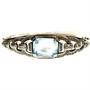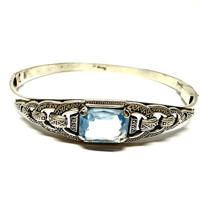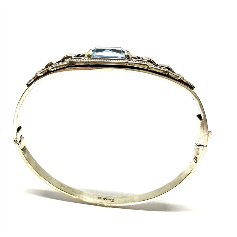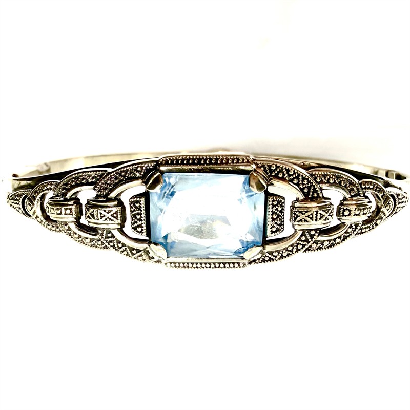 Půvabný stříbrný náramek - otvíratelný kruh zhotovený ve stylu Art deco v první polovině 20.století. Šperk zdobí fazetově vybroušen, blankytně modrý spinel. Stříbro ryzosti 835/1000. Celková váha 14,58 g, průměr 6 cm. Náramek je značen ryzostní, autorskou a puncovní značkou. Výborný stav.