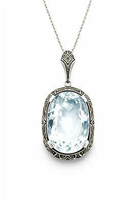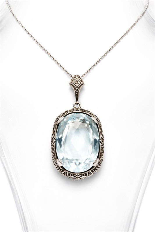Půvabný, stříbrný náhrdelník zdobený odnímatelným závěsem zhotoveným ve stylu Art deco v první polovině 20.století. Šperk zdobí světle modrý akvamarín fazetového brusu. Stříbro ryzosti 935/1000. Řetízek dlouhý 42 cm. Závěs cca 3 x 1,5 cm. Celková váha šperku 5,80 g. Výborný stav.
