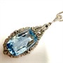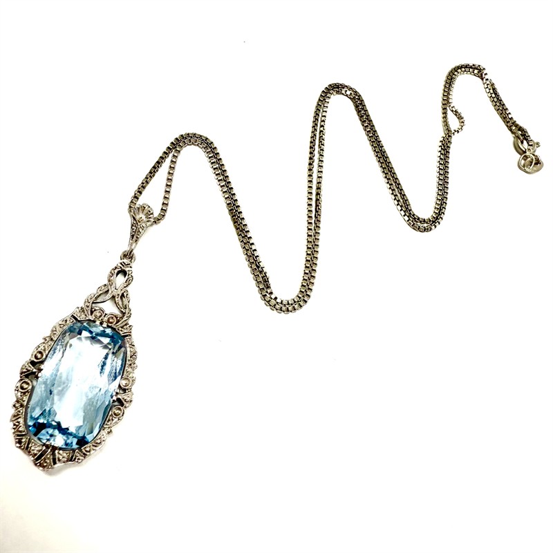 Půvabný, jemně dekorovaný stříbrný náhrdelník - řetízek s odnímatelným závěsem zhotoveným ve stylu Art deco. Šperk zdobí blankytně modrý spinel fazetového brusu. Závěs byl vyroben ze sterlingového stříbra (925/1000), o celkové váze 10,69 g. Řetízek délky 52 cm byl vyroben ze stříbra ryzosti 835/1000. Autentický, starý šperk v perfektním stavu.