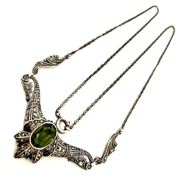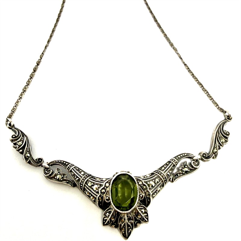 Půvabný, něžný náhrdelník zhotovený ze stříbra ve stylu Art deco. Volutový řetízek zdobí tvarovaný ověs osazený na středu tmavě zeleným, transparentním kamenem a mnoha drobnými, elegantními markazity. Šperk byl vyroben ze stříbra sterlingové ryzosti (925/1000). Celková váha 6,17 g. Délka 43,5 cm. Výborný stav.