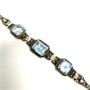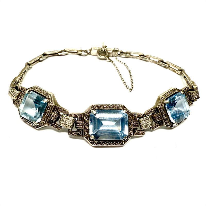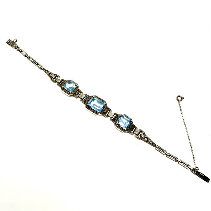 Půvabný náramek zhotovený ve stylu Art deco v první polovině 20.století. Šperk zdobí tři blankytně modré spinely fazetového brusu. Stříbro ryzosti 830/1000, celková váha 12,00 g. K náramku je doloženo osvědčení Puncovního úřadu. Délka 18 cm, funkční pojistný řetízek. Výborný stav.