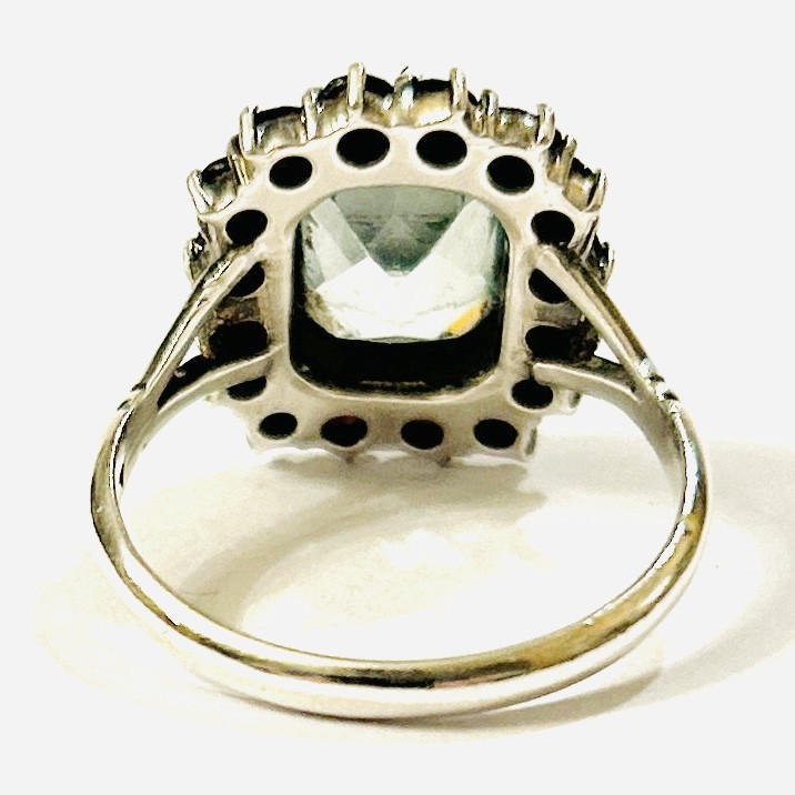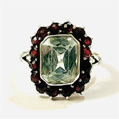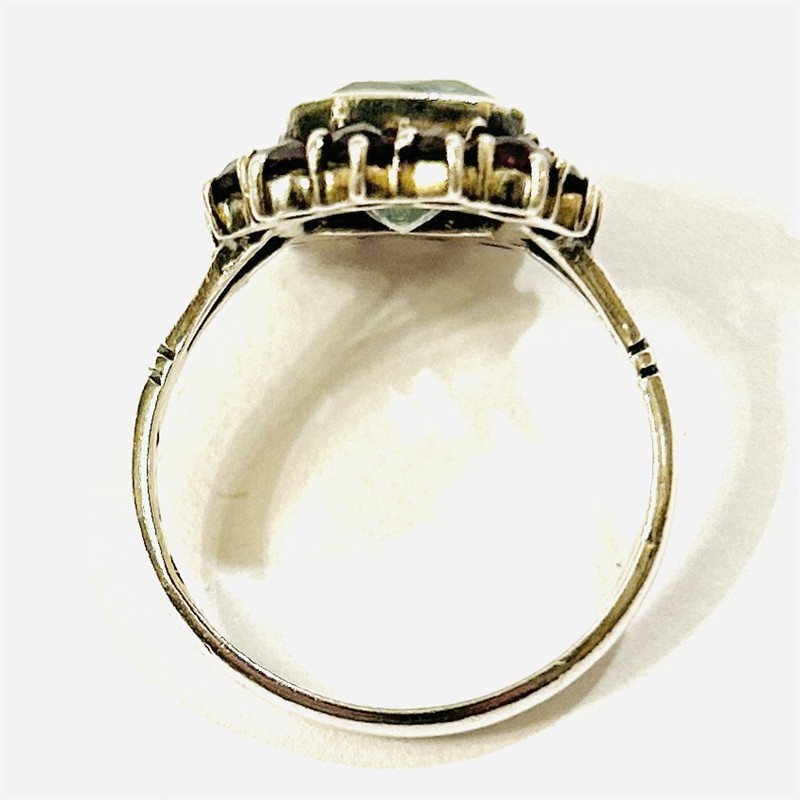Elegantní prsten z období art-deco, hlavice osazena centrálním modro-zeleným kamenem obdélného brusu, rámováno českými granáty kulatého šachovnicového brusu, fasováno obrubou a zrnkovou technikou. Tuzemská granátnická práce z 30. let 20. století. Zhotoveno z nezlaceného stříbra o ryzosti 900/1000; prvorepublikový punc S-46 (slovenské trojvrší 3), ryzostní číslo a mistrovská značka zevnitř šíny. Hmotnost 3,98 g, velikost 58, délka hlavice 17 mm, šířka 19 mm. Centrální kámen lehce uvolněný a podřený, nehrozí však vypadnutí, stopy nošení, celkově v dobrém stavu.