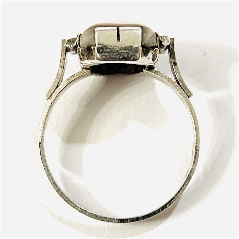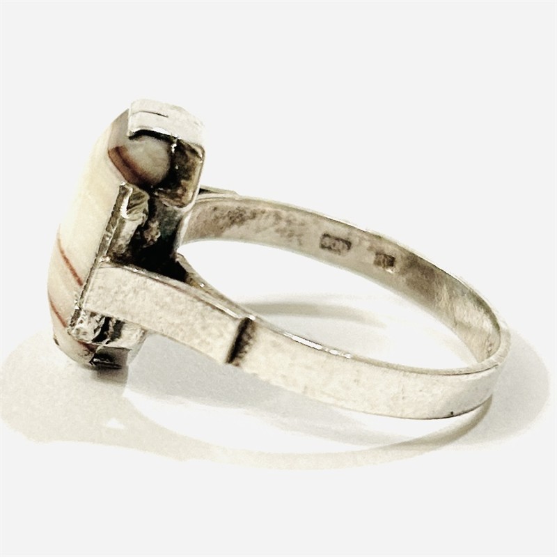 Elegantní prsten z období art-deco osazený přírodním karlovarským vřídlovcem obdélného plochého zaobleného brusu, lišty hlavice jemně ryty. Kvalitní zlatnická práce turnovského klenotníka Josefa Hokeho z 40. let 20. století, potažmo z 2. poloviny 30. let 20. století s označením po roce 1945. Zhotoveno z nezlaceného stříbra o ryzosti 800/1000; československý punc S-48 (kozlík 5) zvnějšku šíny, ryzostní číslo a mistrovská značka "JH" zevnitř šíny. Hmotnost 3,64 g, velikost 62, délka hlavice 14 mm, šířka 15 mm. Ve velmi zachovalém stavu, odborně vyčištěno a vyleštěno zlatníkem.