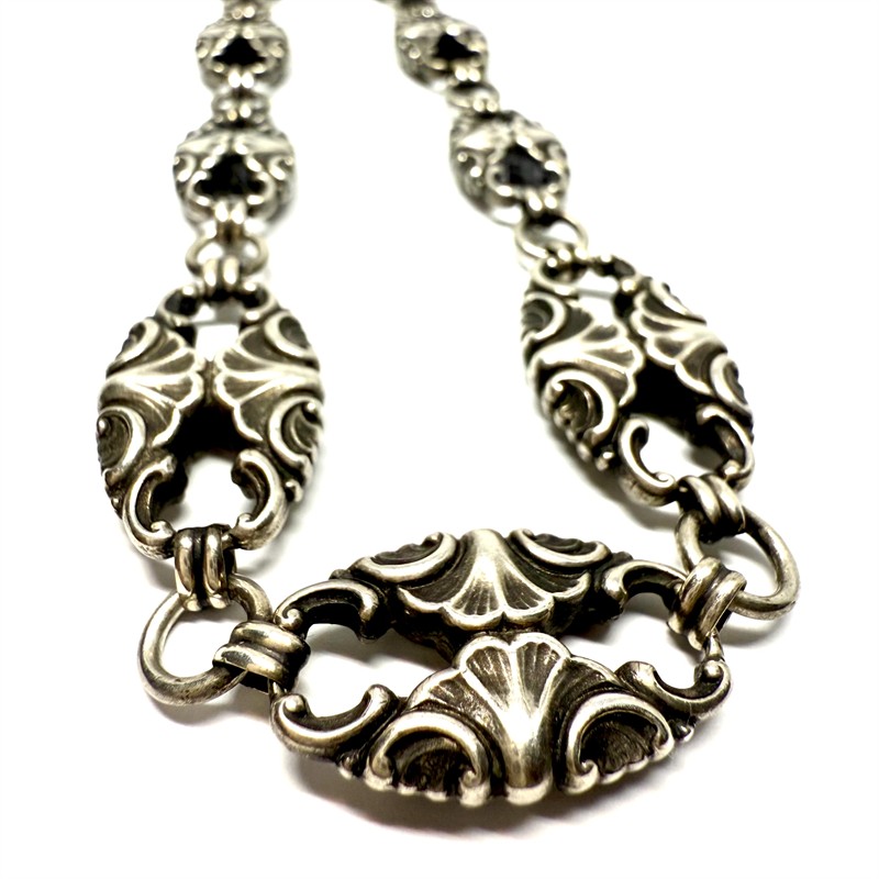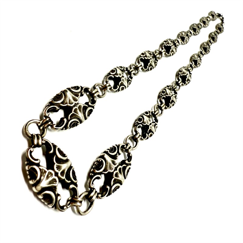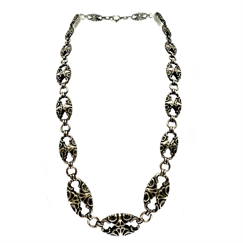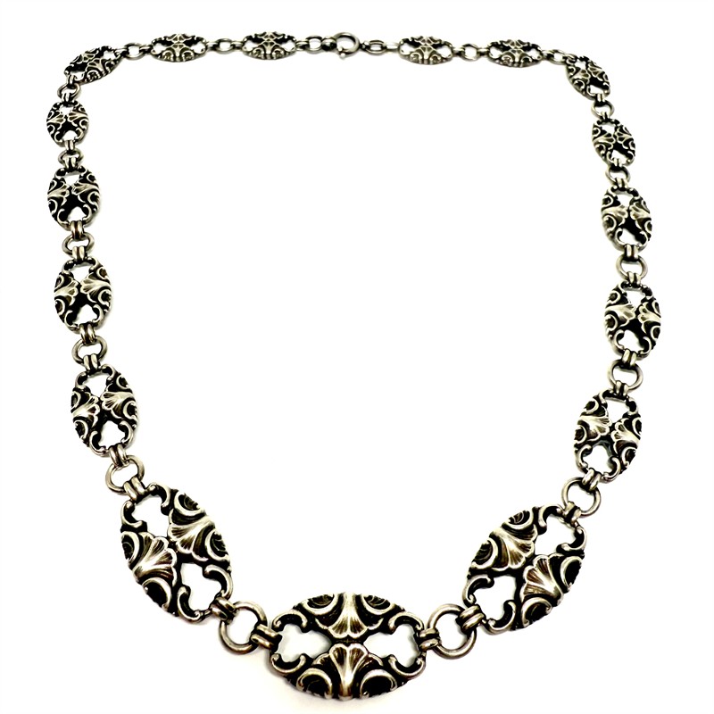 Velmi půvabný, stříbrný, článkový náhrdelník. Šperk byl zhotoven ze stříbra ryzosti 835/1000 v první polovině 20. století. Plasticky zdobené články nesou secesní nádech. Celková váha 15,79 g. Délka 46,5 cm. Šperk je označen mistrovskou, ryzostní a puncovní značkou. Starý, autentický šperk v perfektním stavu.