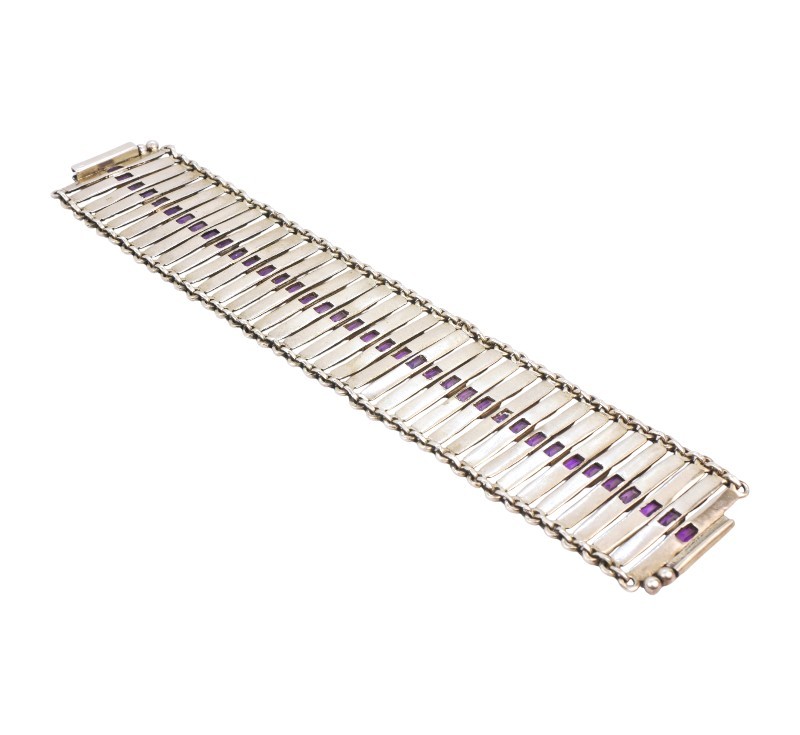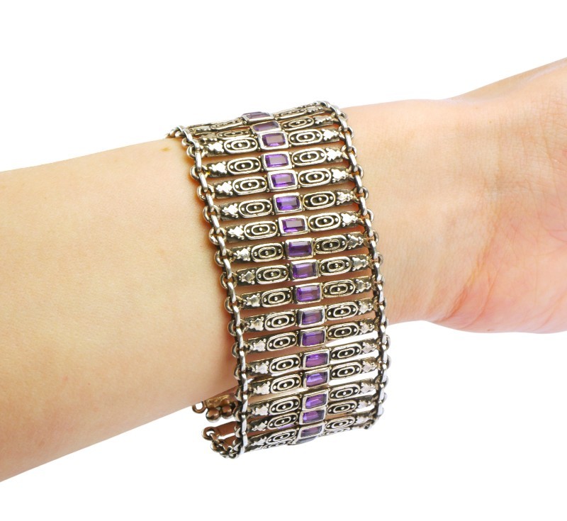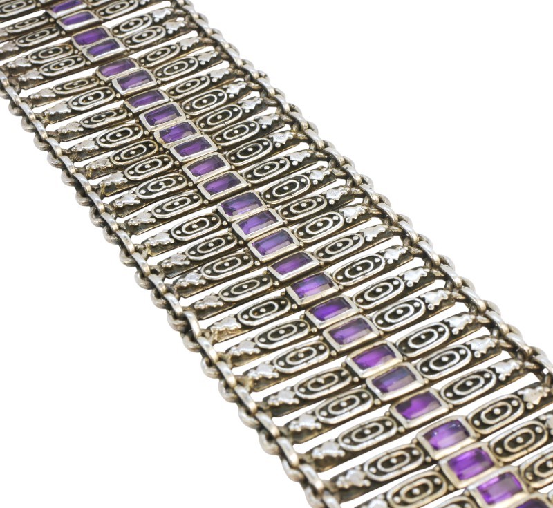 Široký článkový náramek vyrobený ze stříbra ryzosti 925/1000, zdobený ametysty. Délka náramku 17,5 cm, šířka 3,5 cm. Celková hmotnost 52,80 g.