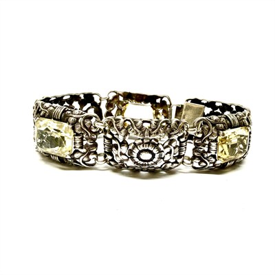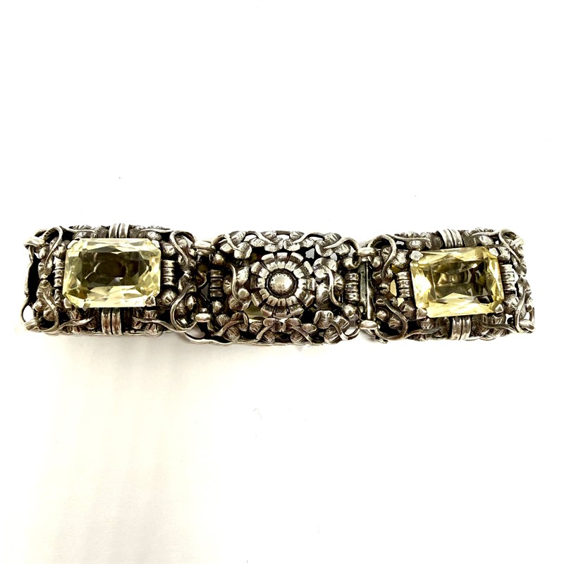 Výrazný,článkový náramek z období první republiky. Šperk byl zhotoven ze sterlingového stříbra(925/1000) o celkové váze 37,60 g. Jednotlivé články zdobí plastický,florální motiv či jiskrný,fazetově vybroušený citrín střední barevné sytosti. Délka 18,5 cm,šířka 2 cm. Perfektní stav.